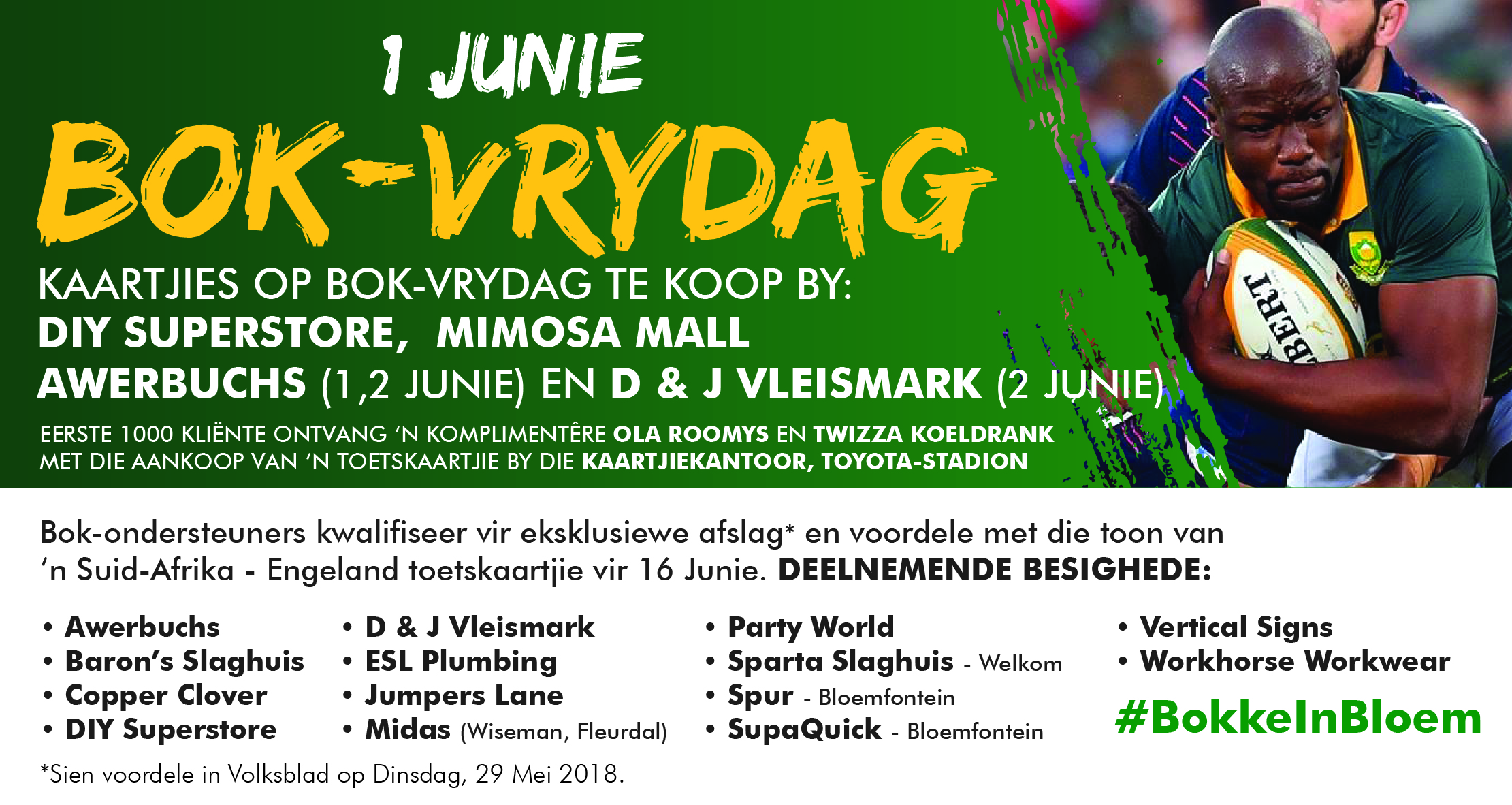 Celebrate this momentous occasion with a bumper Bok Friday on 1 June 2018 in the City of Roses.