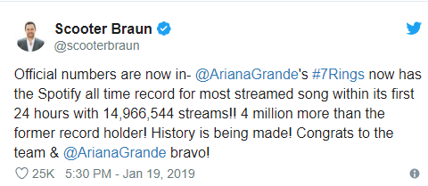 Ariana Grande's 7 Rings Shatters Spotify 24 Hour Record..─── 16:13 Mon, 21 Jan 2019