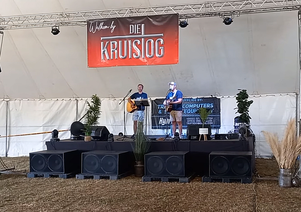 Twee boere van Vredefort, Richann Brüssouw en Andries d’Alebout, het die lofprysing en aanbidding in die tent gelei. Foto: Videogreep