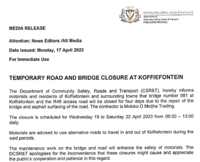 Earlier this week, the department informed motorists in the area that the bridge, together with the R48 access road, will be closed from 09:00 to 13:00 from Wednesday 19 April to Saturday 22 April, to allow repairs to take place on the bridge and asphalt surfacing of the road.