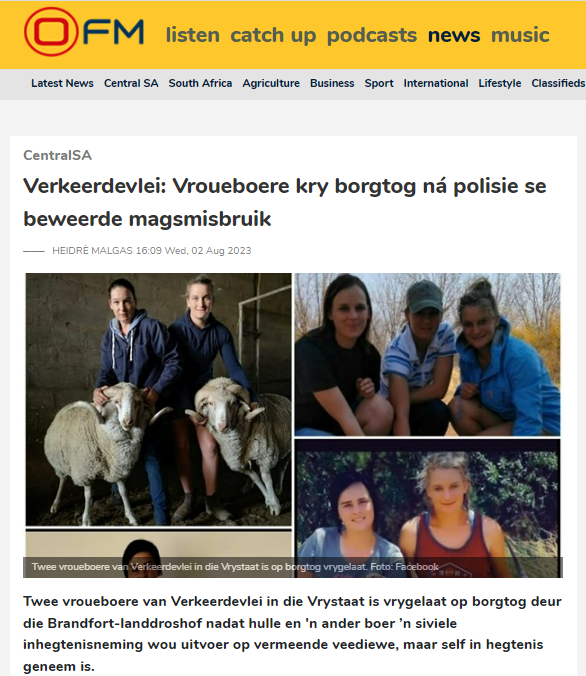 Die burgerregteorganisasie AfriForum het ’n regsverteenwoordiger aangestel om die saak teen die twee vroueboere en ’n boer van ’n buurplaas, wat ook in hegtenis geneem is, noukeurig te volg. “Die manier waarop hierdie boere in hegtenis geneem is, is baie verdag. Dit lyk na ’n intimidasietaktiek deur die polisie,“ sê Jacques Broodryk, AfriForum se woordvoerder vir Gemeenskapsveiligheid.