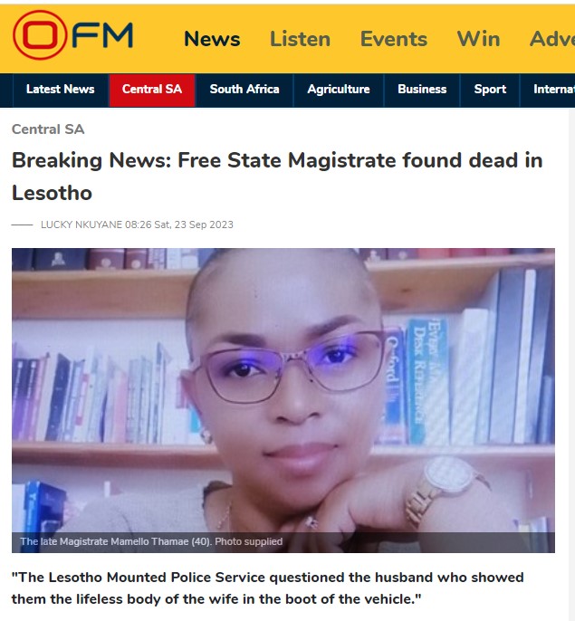 On Thursday (5/10), Free State Magistrate Mamello Thamae’s body was repatriated from the neighbouring country of Lesotho. OFM News understands the body of the murdered magistrate was kidnapped and murdered, allegedly by her husband. She was found in Lesotho after she was reported missing on Thursday (21/9).
