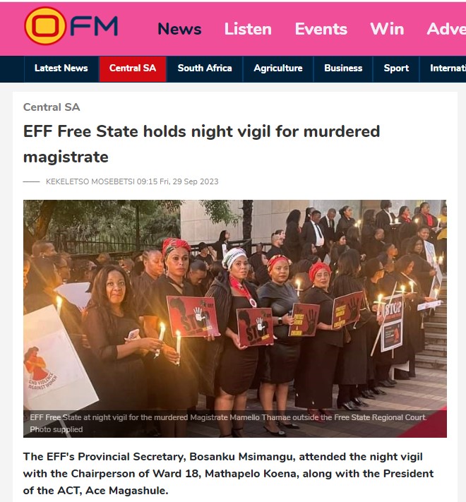 OFM News previously reported that the EFF held a night vigil for the slain magistrate in Bloemfontein.