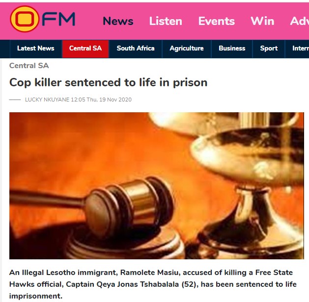 In 2020, an illegal Lesotho immigrant, Ramolete Masiu, was accused of killing a Free State Hawks official, Captain Qeya Jonas Tshabalala (52), and was sentenced to life imprisonment.