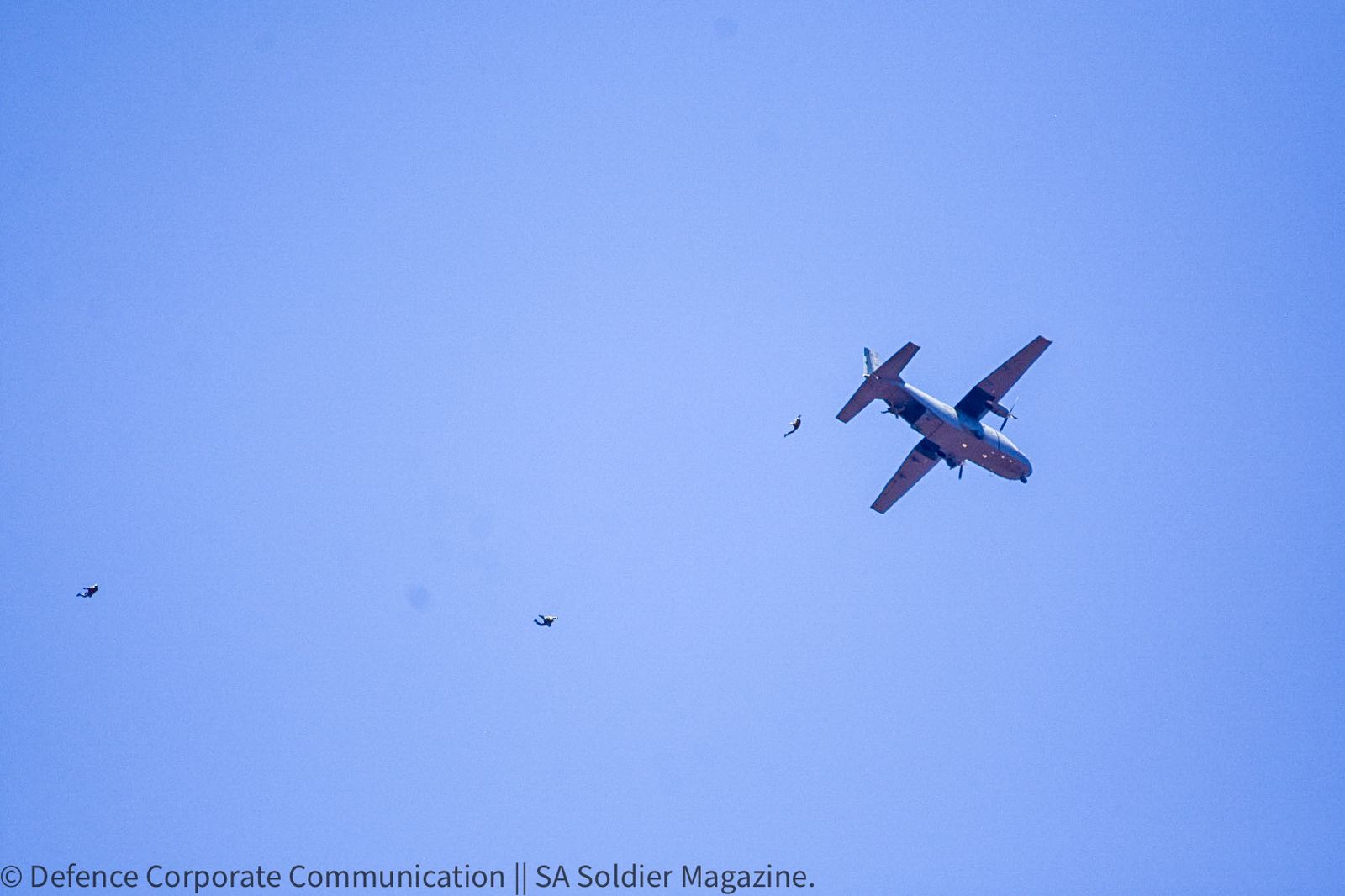 Valskermsoldate spring uit die vliegtuig tydens die oefening. Foto: Facebook