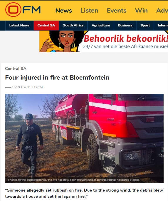 Four casualties were reported yesterday when a house burnt down after the strong wind fanned flames from burning debris at Langenhovenpark in Bloemfontein. This was after someone allegedly set alight waste and due to the strong wind, the debris blew towards a house and ignited the fire.