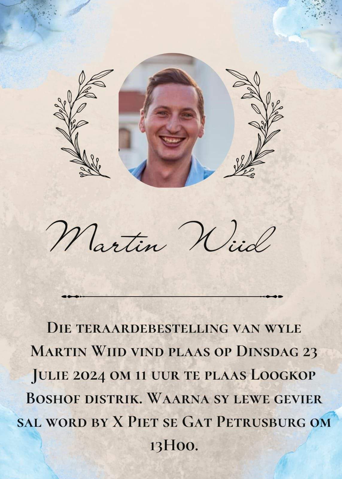 “Martin Wiid (27) is ’n week gelede omstreeks 23:00 ná ’n geselligheid met ’n skietwond in die kop buite die kuierplek in Heuwelsig gekry.”