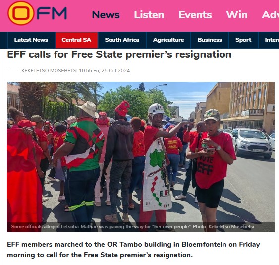 On Friday morning (25/10), the EFF led a march of the affected workers to the premier’s office in Bloemfontein, where they handed over a memorandum demanding premier Maqueen Letsoha-Mathae’s resignation.