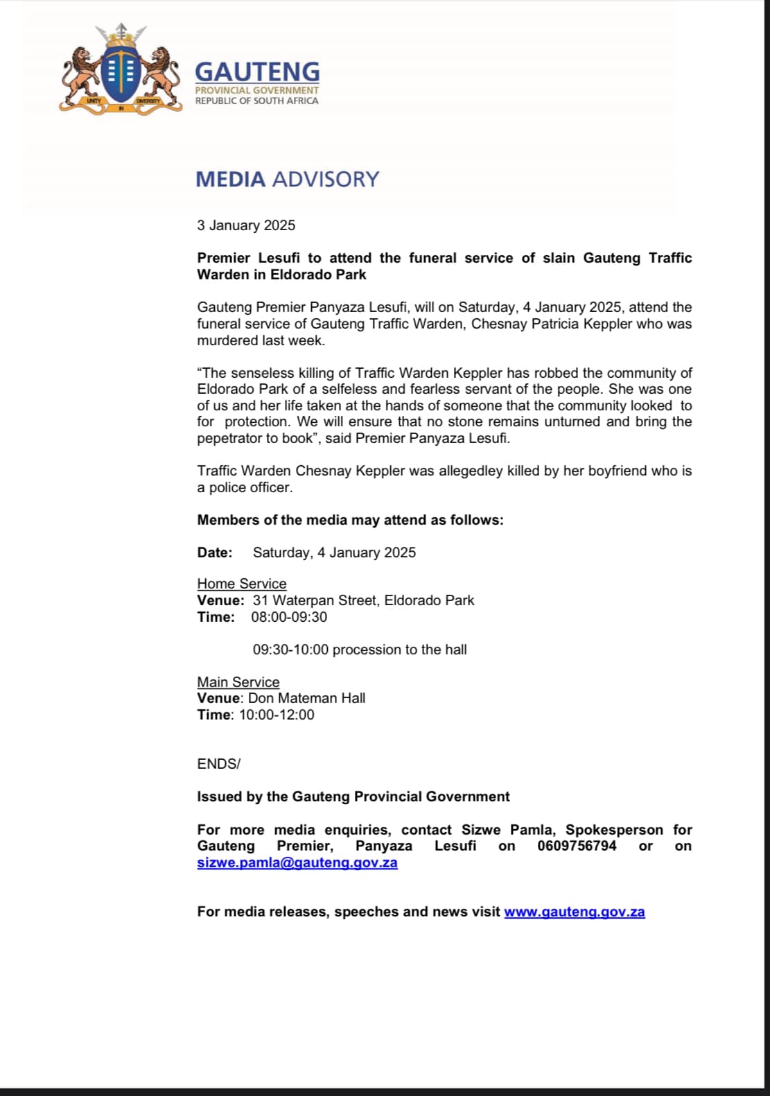 Die Gautengse premier sal Saterdag (4/1) die begrafnis bywoon van ’n vrou wat na bewering deur ’n polisiesersant vermoor is.
