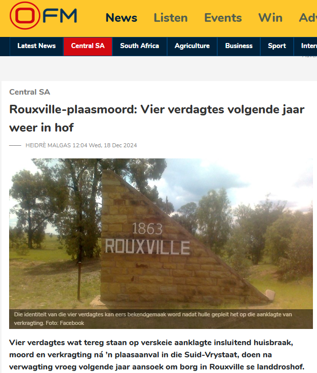 Intussen sal vier beskuldigdes Maandag (13/1) in die Rouxville-landdroshof om borgtog aansoek. Op Saterdag 7 Desember is ’n boer dood en sy vrou ontvoer tydens ’n plaasaanval in die Goedemoed-omgewing.