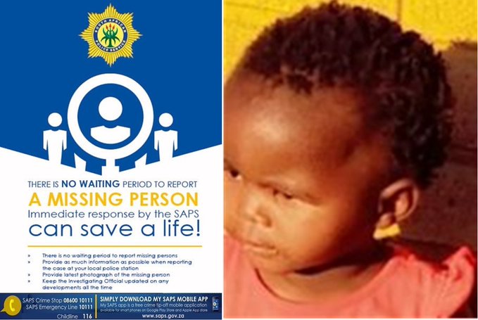 In Noordwes het Tshiamo Mompate (2) Woensdag (15/1) naby die plaas Rooikuil by Hartbeesfontein verdwyn. Sy het ’n grys T-hemp met oranje patrone en ’n blou denim aangehad.