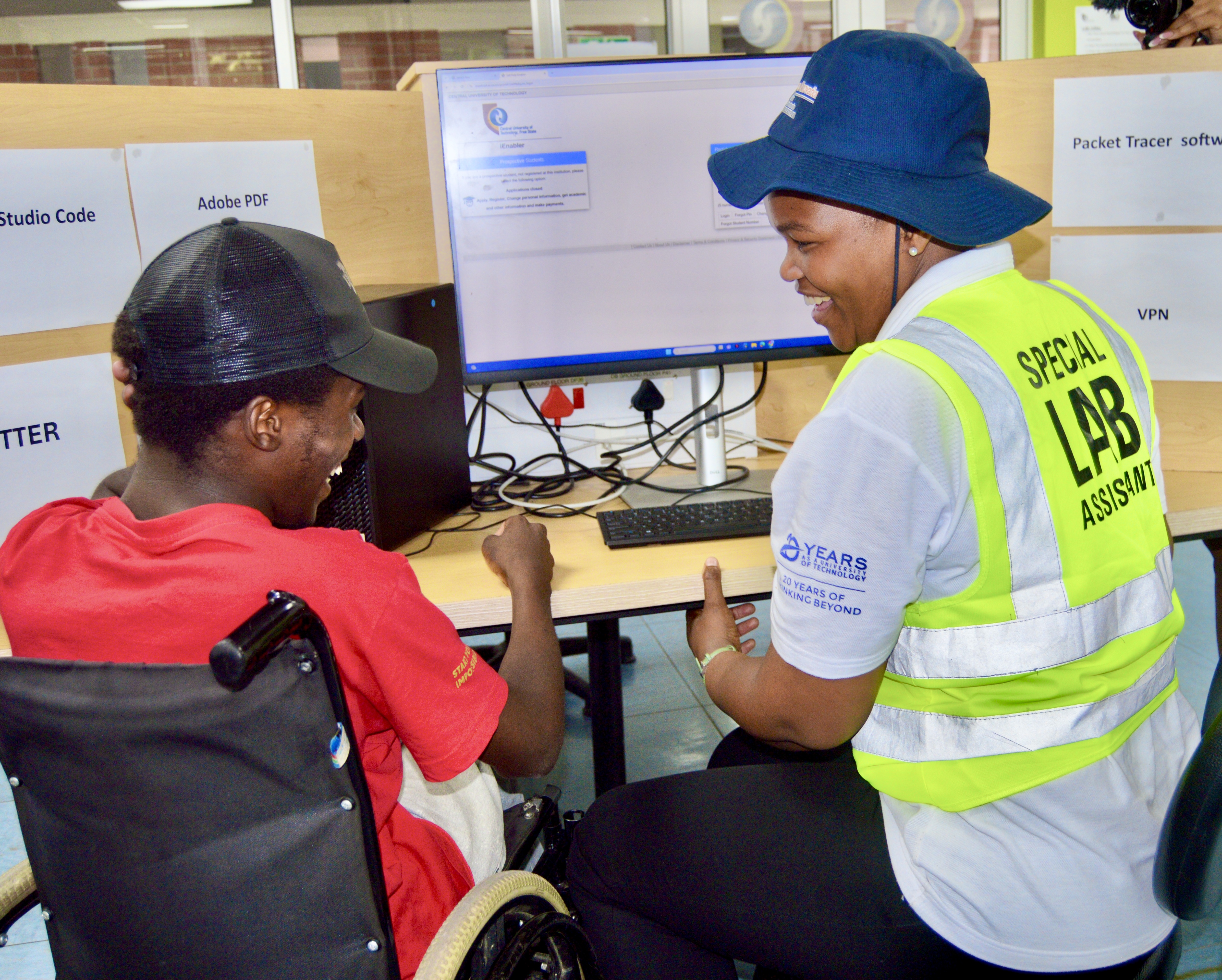 Juliet Setshego, ’n laboratoriumassistent van SUT neem Kananelo deur die registrasieproses. Foto: SUT