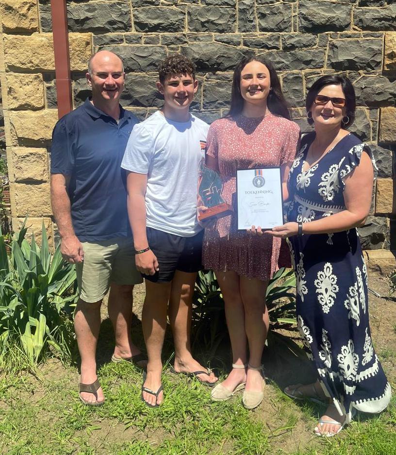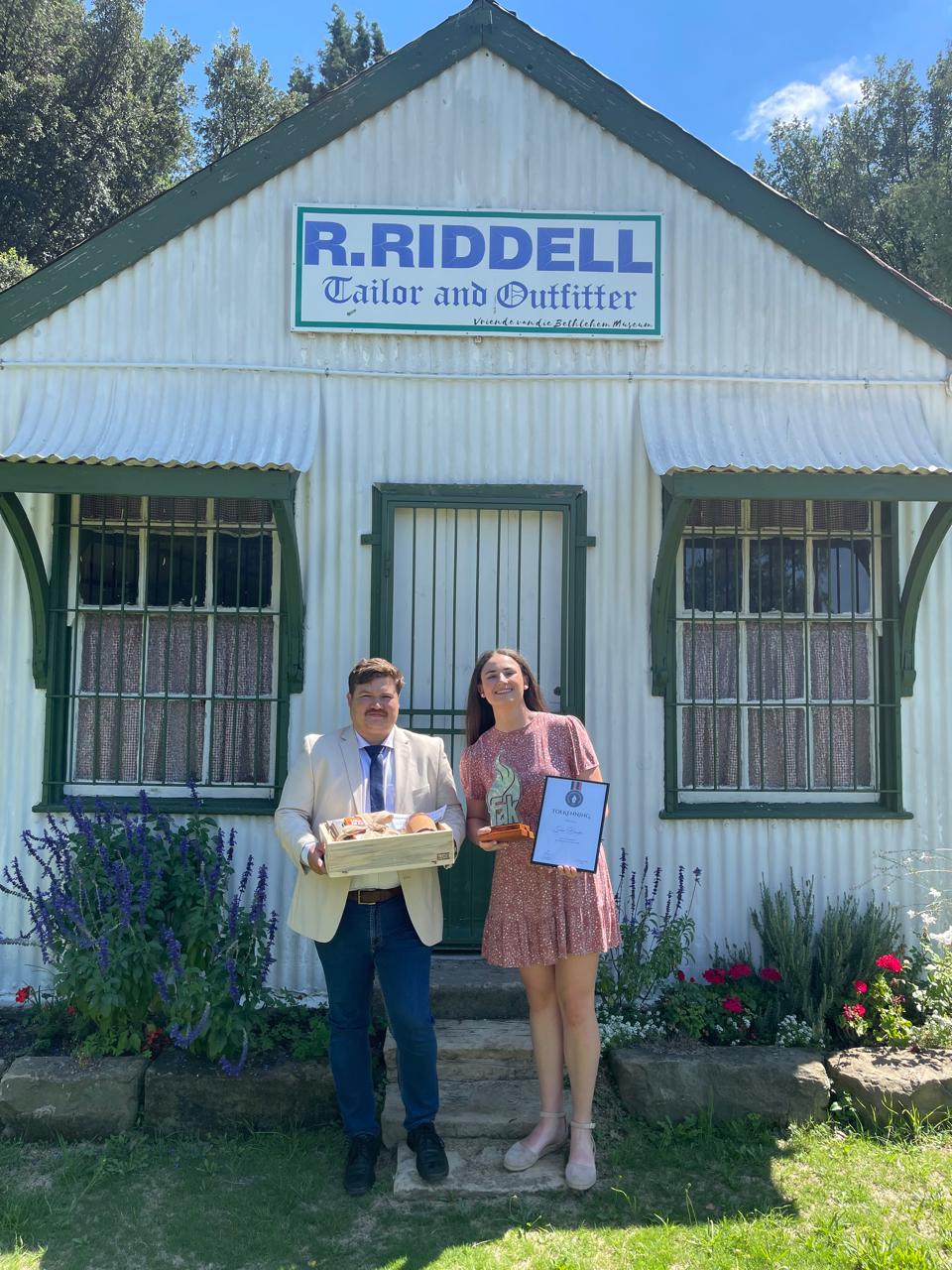 Pieter-Ben Roos, FAK-veldtoghoof, het Saterdag (25/1) in die Bethlehemse museum ’n geskenkpak met geskenkbewyse, ’n FAK-trofee en sertifikaat aan haar oorhandig.