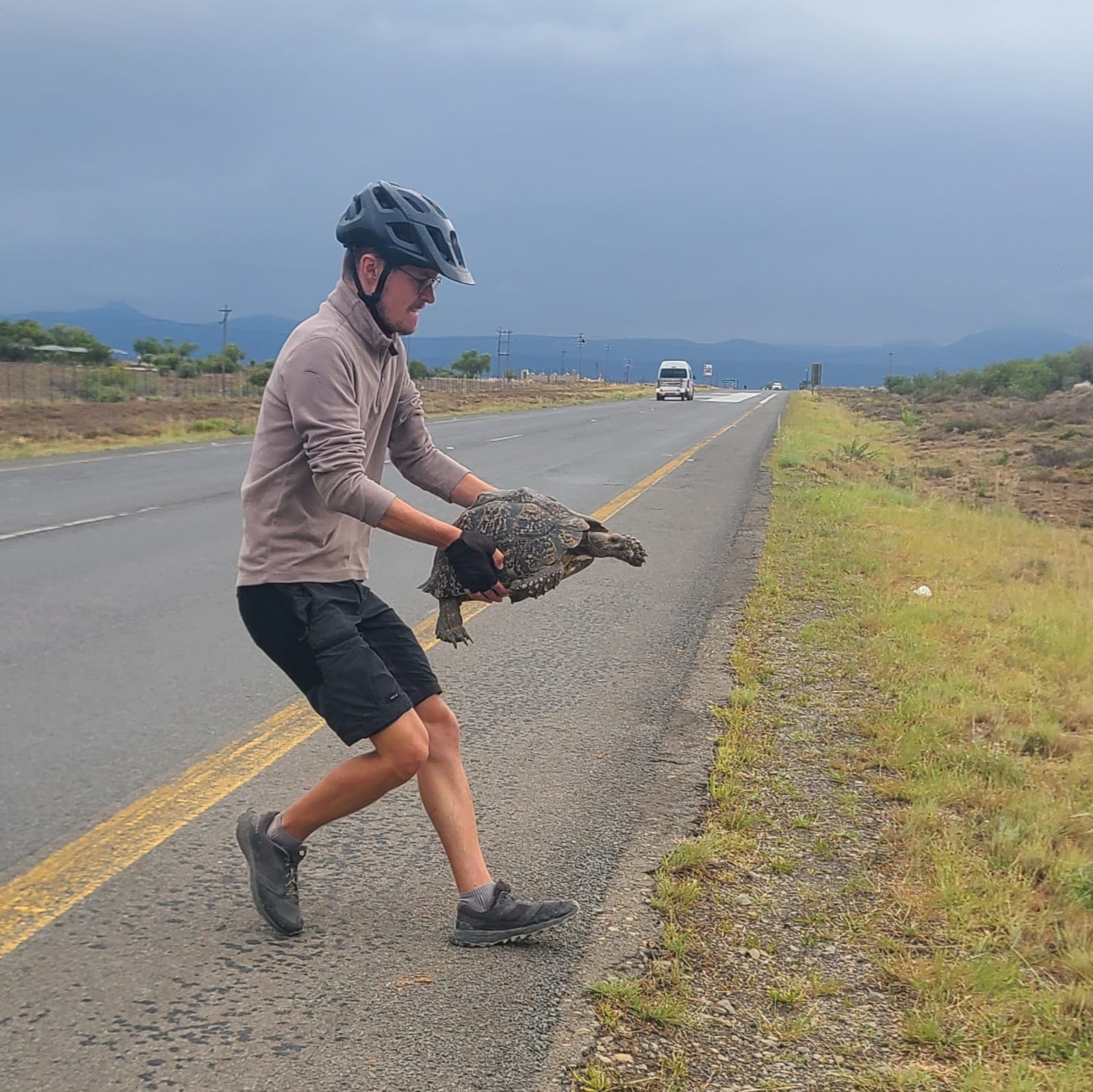 Yohann Hervy (28) het so tussen die fietsry deur tyd gemaak om ’n skilpad se lewe te red. Foto verskaf