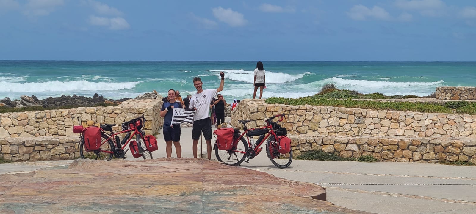 Yohann Hervy en Émeline Féat is ’n paartjie van Frankryk wat reeds sewe maande op ’n fietstoer deur die wêreld reis. Hier is hulle by Kaap Agulhas, die mees suidelikste punte van Afrika. Foto verskaf