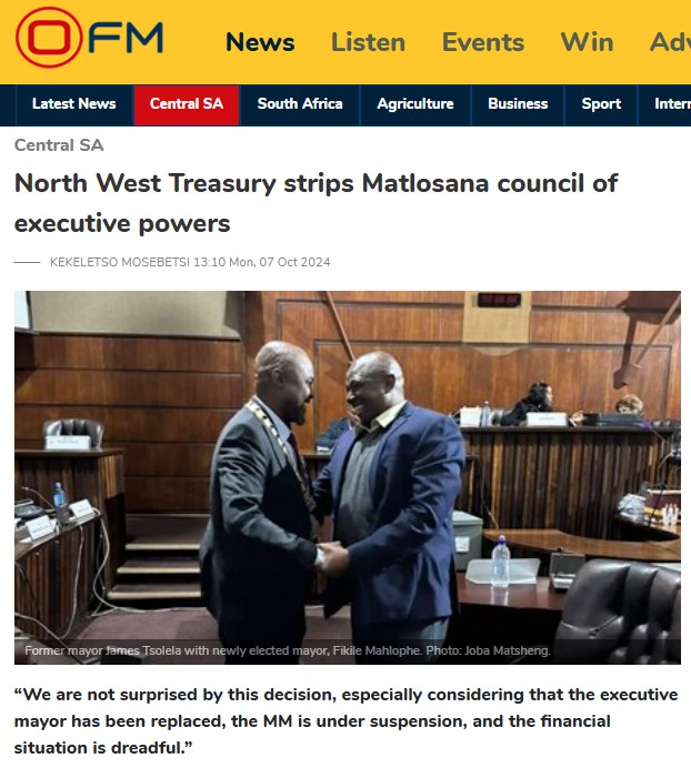 In 2023 het rdl. Johannes le Grange, DA-koukusleier in Matlosana, onthul die munisipaliteit verloor daagliks miljoene rande weens finansiële wanbestuur. In November 2022, is 16 diensverskaffers gekontrakteer om infrastruktuurprobleme die hoof te bied, maar dit het tot stilstand gekom toe die geld binne ’n maand uitgeput was.