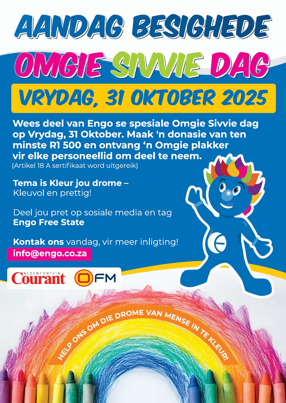 ENGO Vrystaat se Omgiedag vind op 31 Oktober plaas. Die tema vir 2025 is KLEUR JOU DROME, so maak gebruik van hierdie geleentheid om jou individualiteit te wys en die wêreld rondom jou op te helder.