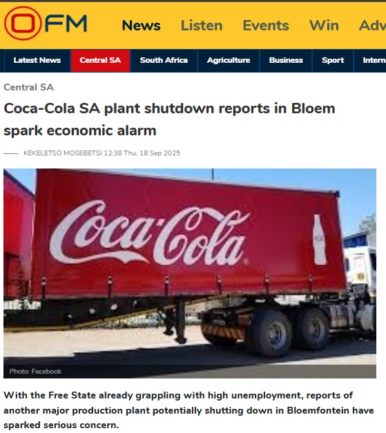 Possible closure of Bloemfontein Coca-Cola plant ‘major economic shock’ to Free State – expert─── KEKELETSO MOSEBETSI 09:59 Wed, 01 Oct 2025