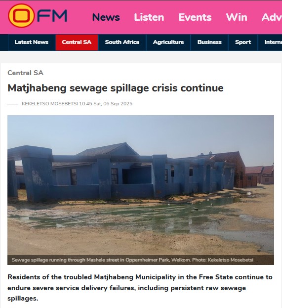 Residents of Matjhabeng continue to struggle with basic service issues such as sewage spillage, potholes, and constant water cuts. More than 80% of streetlights are also reported to be non-functional, raising serious concerns, particularly for vulnerable communities.
