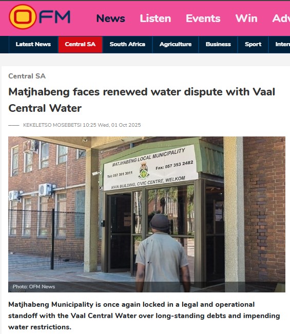 Vaal Central Water has announced it will be implementing water cuts in the Goldfields due to the money it owes. Matjhabeng was recently placed under administration.