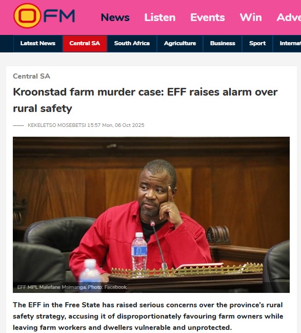 EFF MPL Malefane Bosanku Msimanga condemned what he views as deep flaws in rural safety strategies. The incident highlights systemic issues within the rural safety framework, stressing law enforcement agencies fail to protect the most vulnerable and often appear more concerned with the interests of farm owners, said.