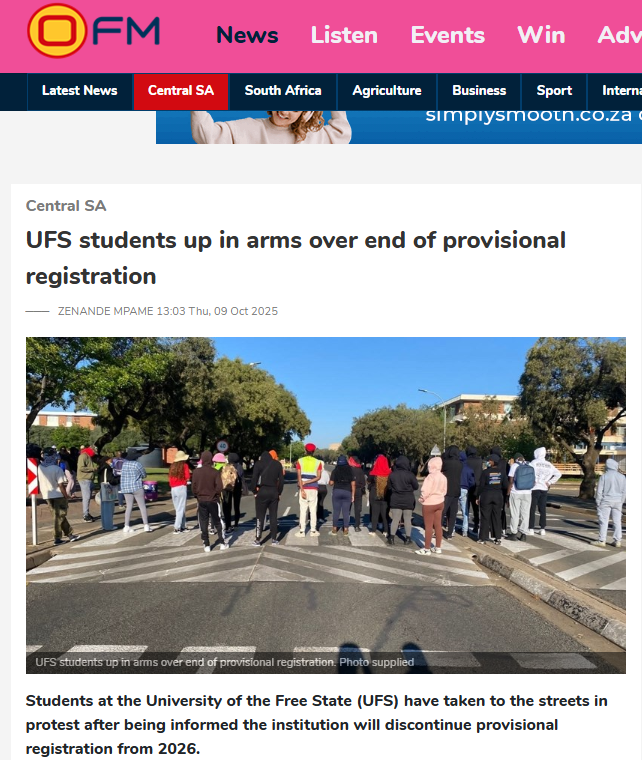 The university decided to move all academic activities of its three campuses (Bloemfontein, South, and Qwaqwa) online, effective from Thursday (9/10), following the disruptions relating to the phasing out of provisional registration at the university.