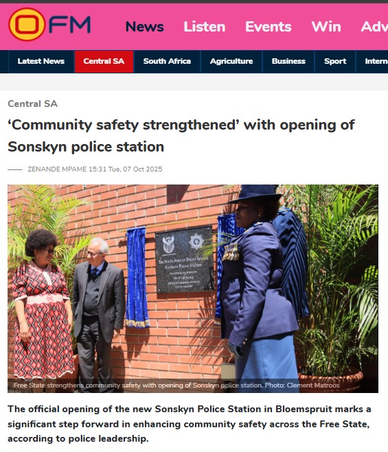 Meanwhile, the Sonskyn police station, a new police station located in Phase 5 of the Mangaung Metro, was officially opened on Tuesday (7/10). Attended by Cachalia, Free State premier MaQueen Letsoha-Mathae, provincial commissioner Lt. Gen. Baile Motswenyane, and national commissioner Gen. Fannie Masemola, the new station, becomes the 112th police facility in the province.