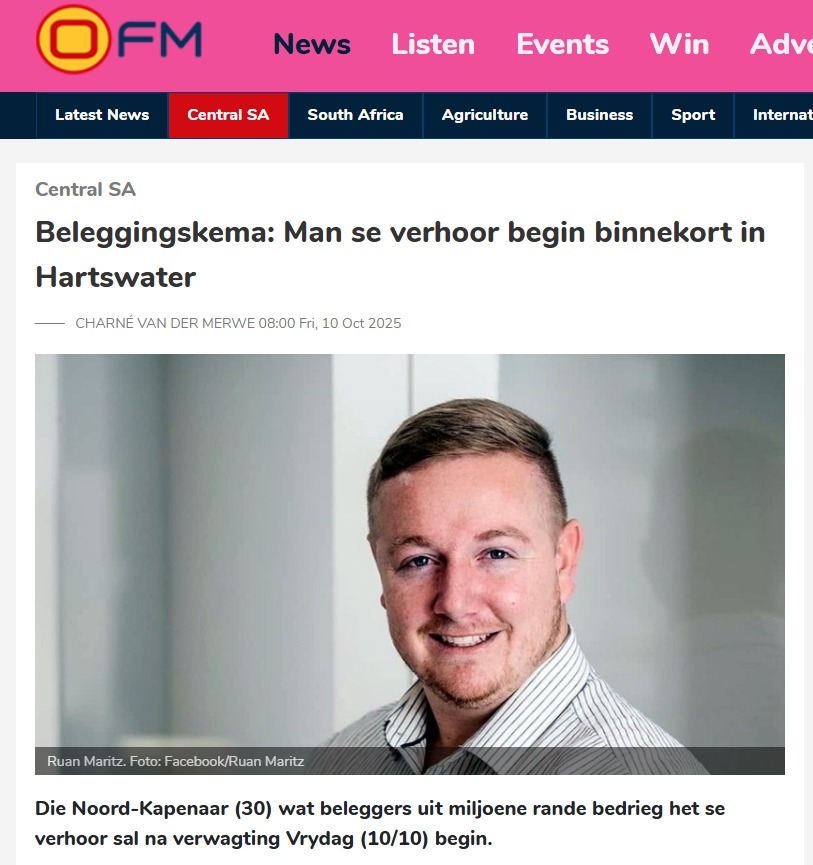 Ruan Maritz het Vrydag (10/10) in Hartswater se handelsmisdaadhof verskyn. Hy staan tereg op aanklagte van bedrog nadat hy na bewering beleggers uit R2 miljoen bedrieg het.