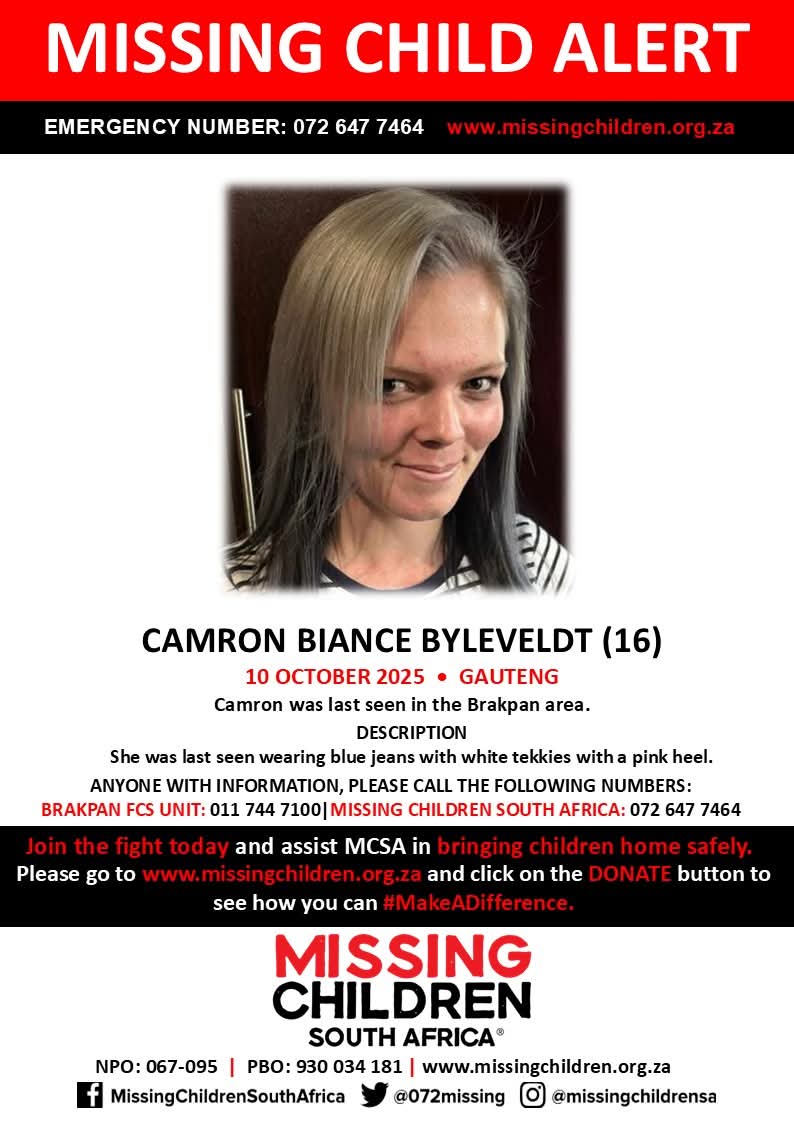 Camron Biance Byleveldt (16) is Vrydag (10/10) omstreeks 09:15 laas by haar huis in Hamiltonlaan, Brakpan, gesien. Sy het ’n blou denim en wit Puma-tekkies met pienk op die hak gedra.