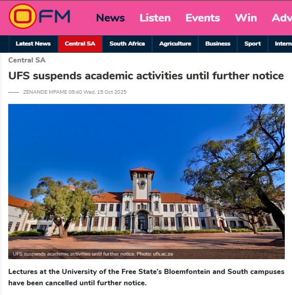 The UFS was recently engulfed by student protests following its decision to phase out provisional registration by 2026 – a move that sparked widespread unrest across all three campuses. Academic activities were disrupted from Monday (13/10), culminating in incidents of vandalism, arson, and injuries to three security personnel.