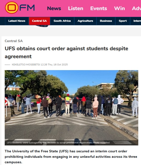 UFS spokesperson Lacea Loader had confirmed university operations resumed in phases after operations were halted. Professional and service staff returned to the Bloemfontein Main and South Campuses on Thursday (17/10). The Qwaqwa Campus remained closed due to extensive infrastructure damage following protests earlier in the week.