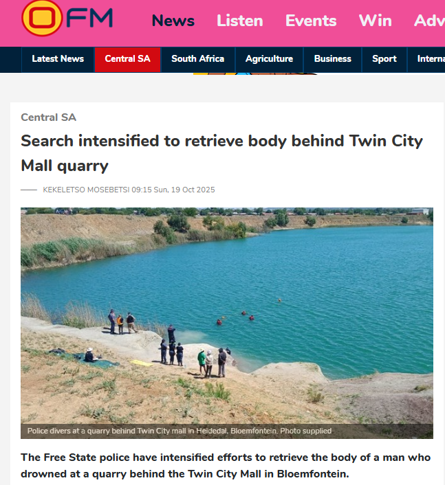 “Die polisie werk nou saam met die nooddienste en private vennote om die herwinningspogings te verskerp,” sê Mahlomola Kareli, Vrystaatse polisiewoordvoerder. Spesialistoerusting en -duikers is ontplooi om die dieper dele te bereik in die hoop om afsluiting vir die treurende familie te bring.