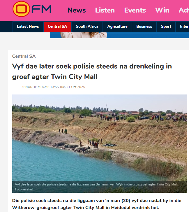 Benjamin van Wyk (20) en twee vriende het Donderdag (16/10) die steengroef besoek om te swem. Hy het glo in die water gespring, gou oorweldig geraak en verdrink. Sy liggaam het onder die water verdwyn en is nog nie gevind nie.