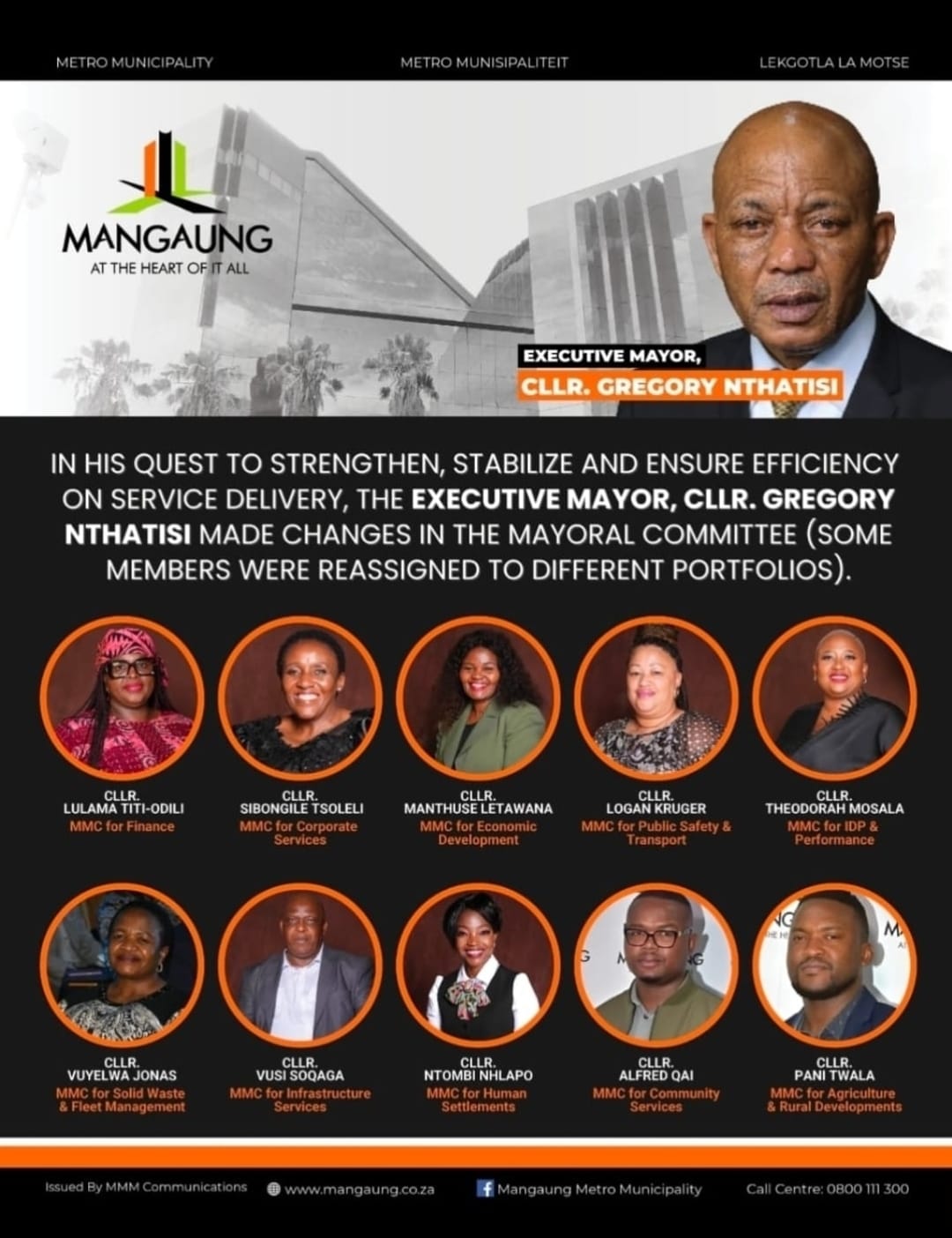 The Mangaung mayor has reshuffled his mayoral committee as part of a broader effort “to strengthen governance and improve service delivery” across the metro.