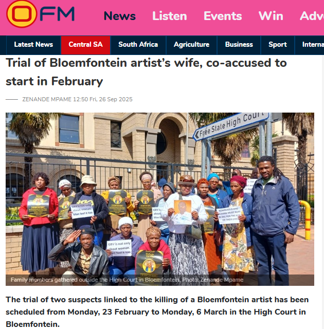 The trial of two men accused of the killing of a Bloemfontein artist has been scheduled from Monday, 23 February to Monday, 6 March in the High Court in Bloemfontein.