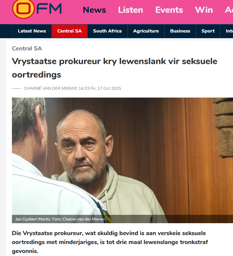 In ’n ander saak van seksuele misbruik in die Vrystaat, is Jan Gysbert Maritz, ’n pa en prokureur, tot drie lewenslange vonnisse gevonnis vir verskeie seksuele oortredings teen minderjariges.