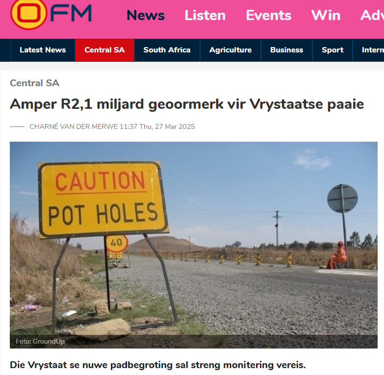 “Ons monitor hierdie projek al jare lank noukeurig en dit is bemoedigend om uiteindelik sigbare verbetering op hierdie noodsaaklike 48 km lange stuk pad te sien,” sê Armand Cloete, VF Plus-leier in die Vrystaat.