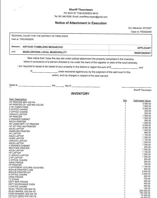 The municipality had been given until Monday (27/10) to pay the outstanding amount, but failed to comply. In response, the sheriff served notice of an attachment of assets, which included a Ford Ranger valued at approximately R750,000, a Suzuki bakkie worth about R250,000, and a Toyota Yaris estimated at R70,000, among other items.