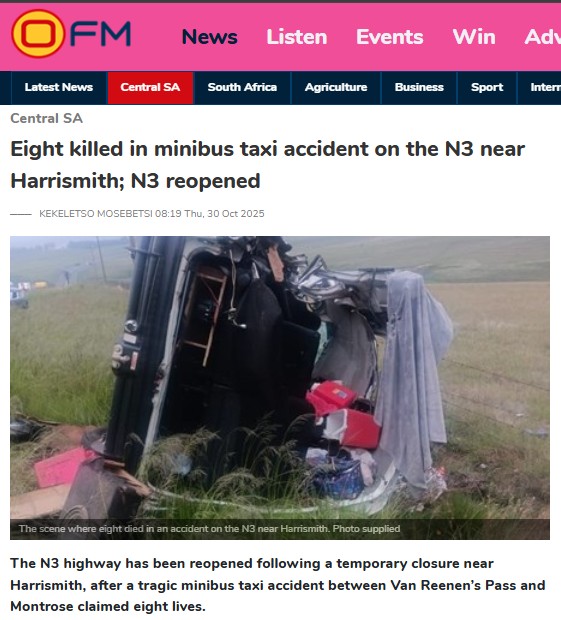 Eight women lost their lives in the accident on the N3 between Van Reenen’s Pass and Montrose. The women were travelling in a minibus taxi that collided with a light truck early on Thursday morning (30/10).