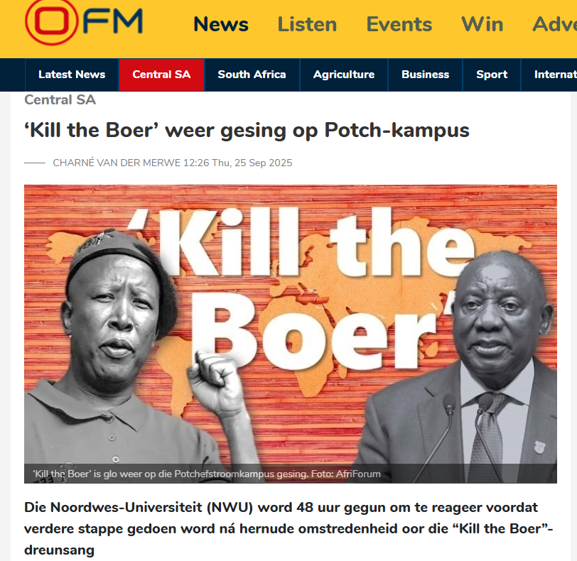 Nuwe eis dat NWU stem dik maak teen ‘Kill the boer’─── 05:12 Sat, 01 Nov 2025