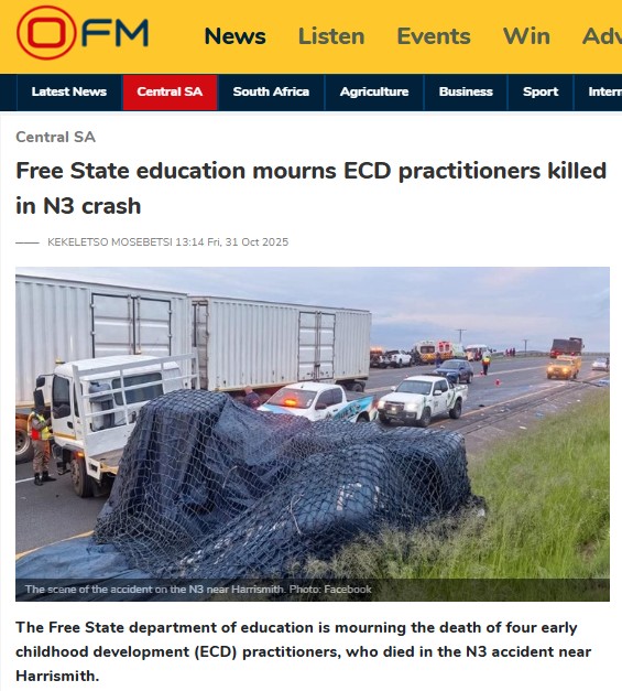 Free State premier renews road safety plea after fatal N3 crash─── KEKELETSO MOSEBETSI 10:27 Mon, 03 Nov 2025