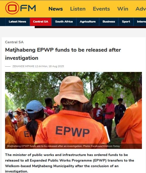 The portfolio committee on cooperative governance and traditional affairs also raised concerns about widespread misuse of EPWP funds during its oversight visit to the province, where it addressed persistent issues of financial underperformance and governance failures. Matjhabeng was among 16 municipalities summoned to parliament to account for financial mismanagement and service delivery challenges.