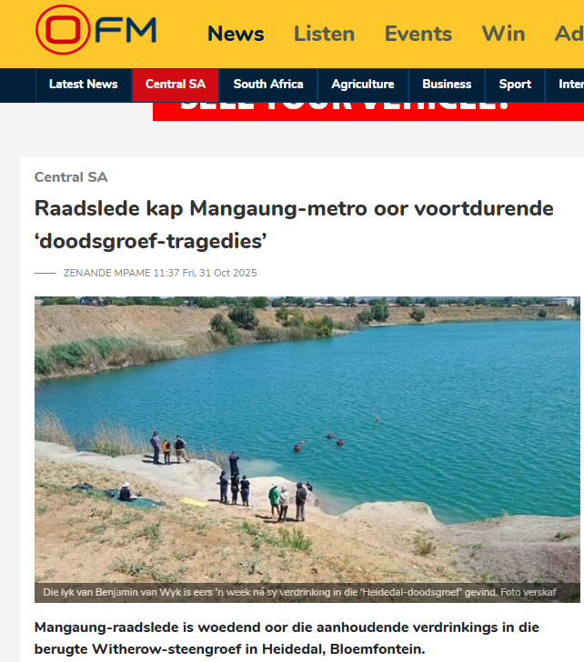 Intussen beskuldig Mangaung-raadslede die metro daarvan dat dit versuim het om inwoners teen hierdie herhalende tragedies te beskerm. Die mees onlangse slagoffer was Benjamin van Wyk (20), wie se liggaam eers ná ’n week se soektog gevind is.