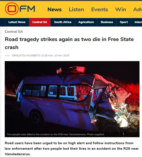 Four lives lost in another Free State road accident─── KEKELETSO MOSEBETSI 09:35 Tue, 11 Nov 2025