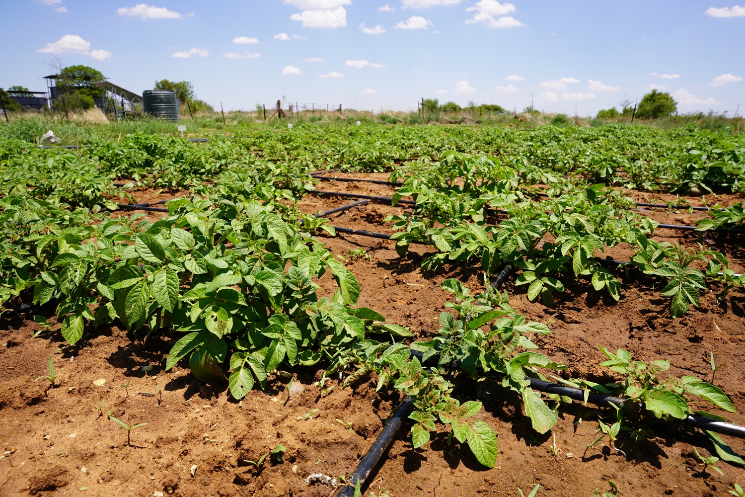 Aartappelplante op Gaongalelwe Moiloa wat onder sonaangedrewe drupbesproeiing is. Foto verskaf