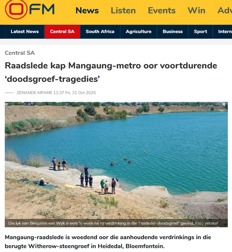 Mangaung councillors have accused the metro of failing to protect residents from the recurring tragedies at the site. They have demanded urgent steps to secure the quarry, including fencing, improved monitoring, and community safety interventions.