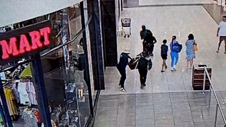 Robbers fleeing with a bag full of jewellery at Northridge Mall. Photo: Screenshot/Video