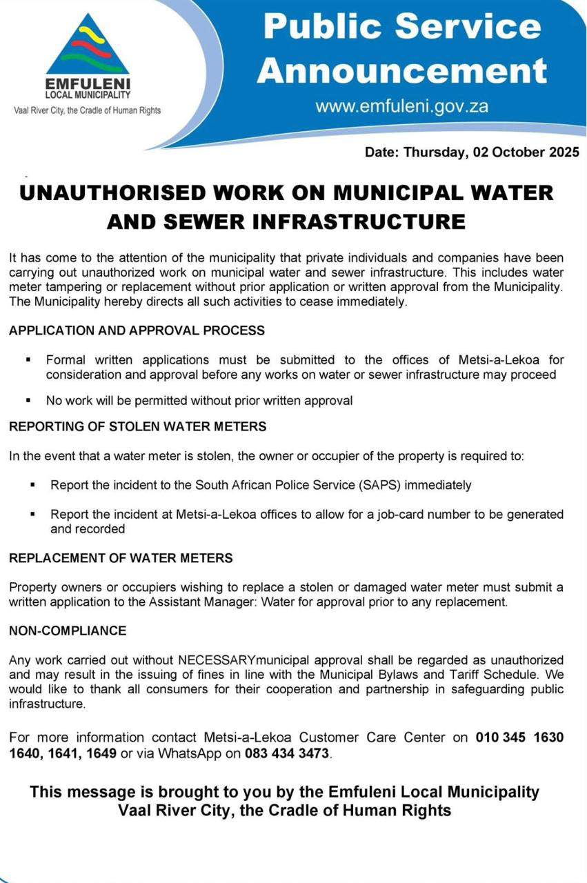 The municipality issued a letter warning residents against seeking help from non-municipal workers. Photo: Facebook/Emfuleni Local Municipality