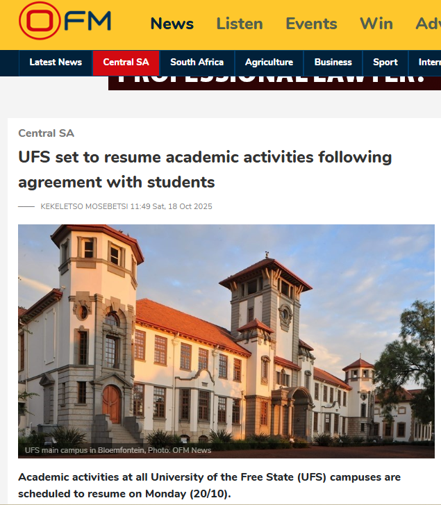 The UFS previously obtained an interim court order prohibiting anyone from engaging in unlawful activities across its three campuses. Academic activities were disrupted from Monday, 13 October, culminating in incidents of vandalism, arson, and injuries to three security personnel.