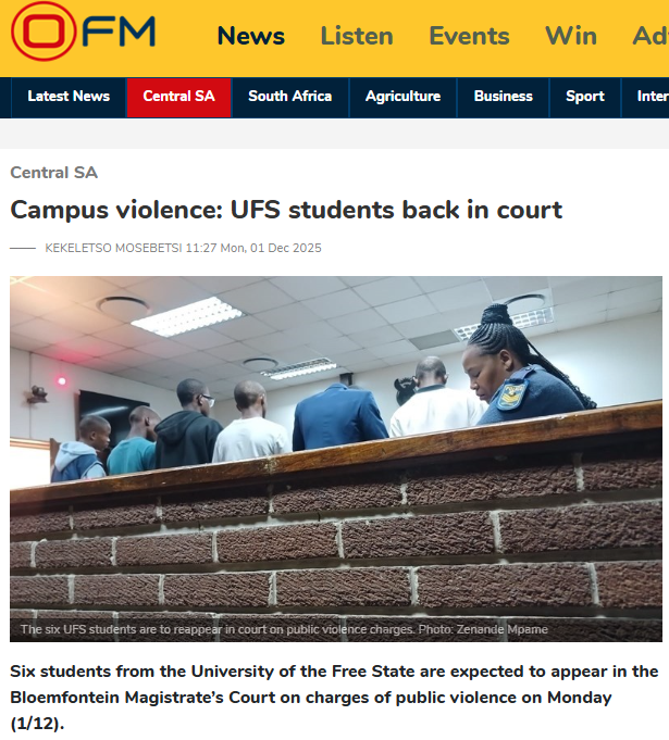 UFS students back in court next year following public violence─── ZENANDE MPAME 10:16 Tue, 02 Dec 2025
